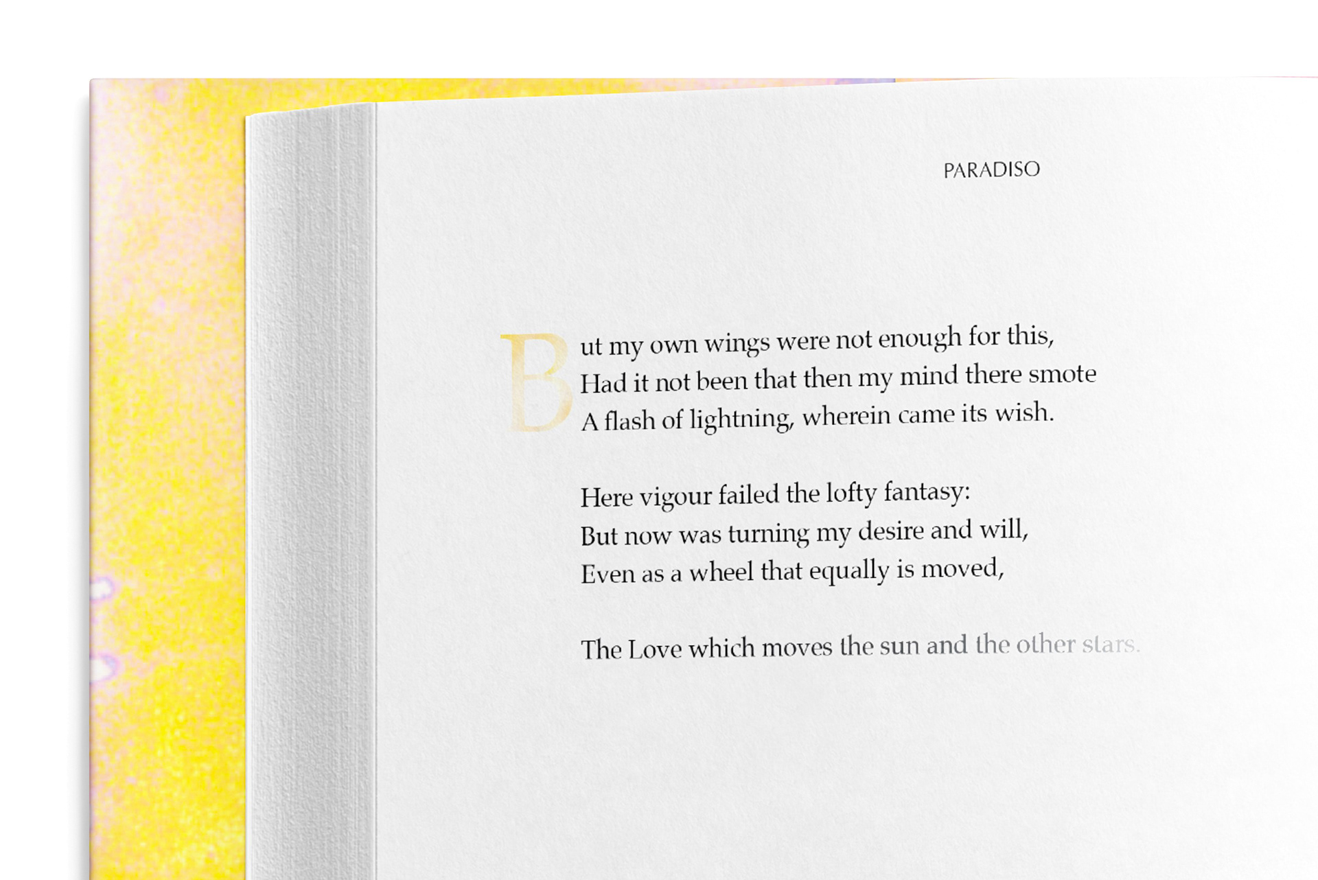 The chapter is split into four distinct sections first a prayer, followed by rises and falls as Dante comes closer to God. To denote these sections each begins with a double spread featuring two contrasting words from a paradox in that section.